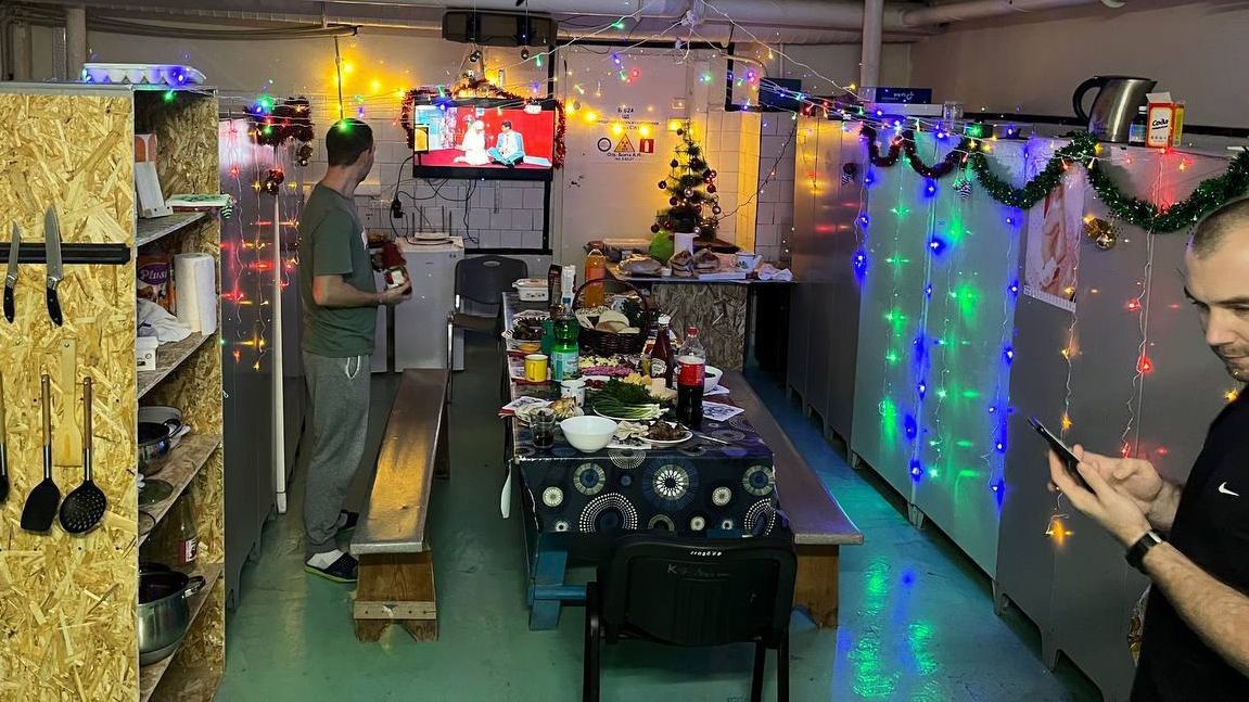 Rosatom employees use a plant room as a dwelling area, with a kitchen setup and a festive desk, on the Zaporizhzhia Nuclear Energy Plant, as seen in a photograph posted on Jan. 20, 2026. (Precise Enerhodar / Telegram)